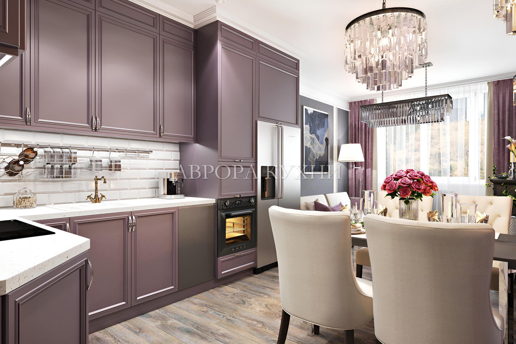 - При создании дизайн-проекта можно составить любую комбинацию цветов, декоров, фрезеровок, а так же дополнить всеми необходимыми комплектующими и бытовой техникой.