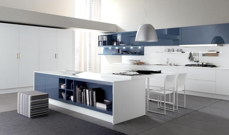 Синяя кухня любит белый цвет стен, но и не против бледно серо-голубого оттенка. Остальные могут заглушить ее яркость.